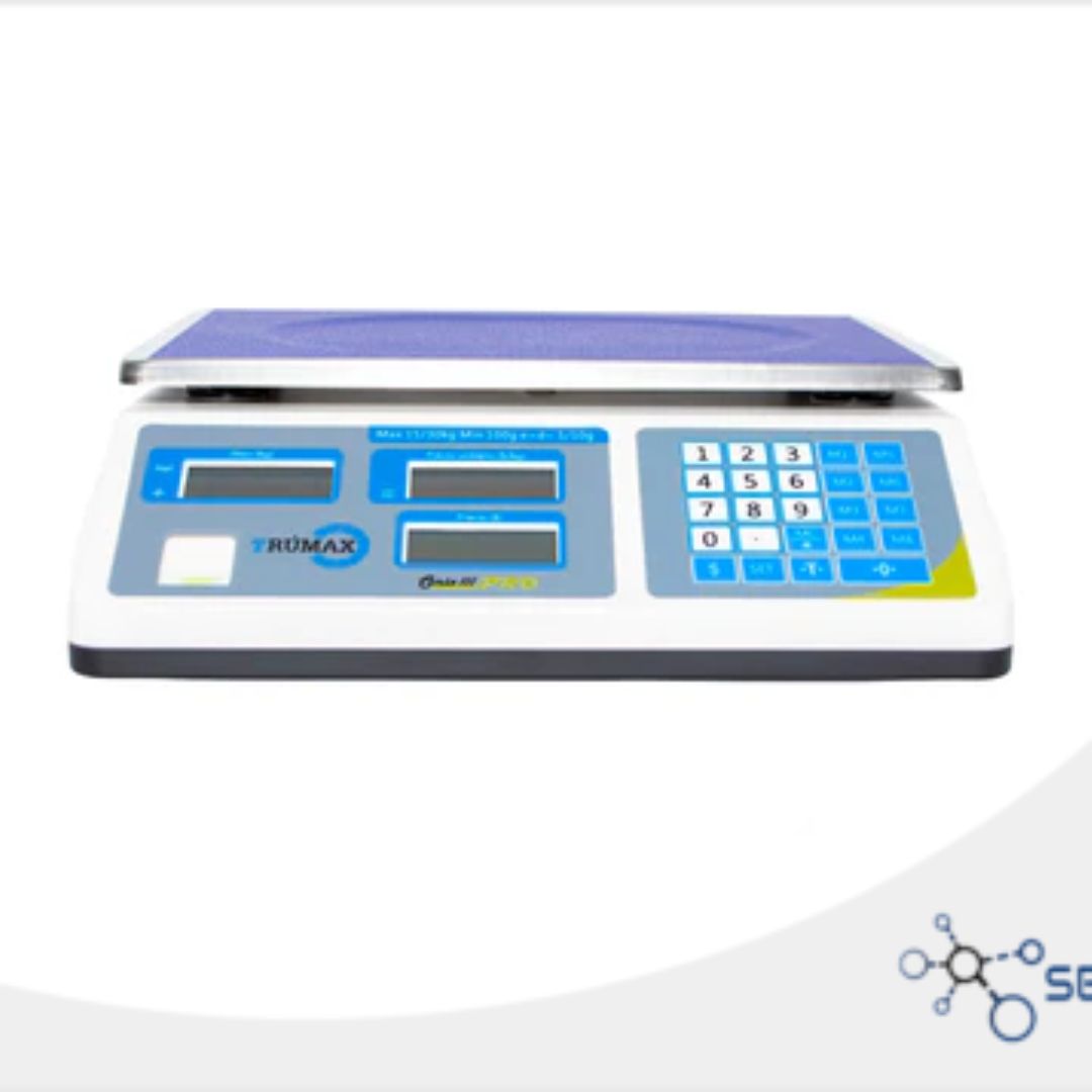 Balanza liquidadora marca Trumax, disponible en version plana, con interfase RS232, fabricada en ABS de alta resistencia, plato en acero inoxidable de 22.5×32.5cm, display LCD, bateria recargable, capacidad maxima:15/30kg, division de escala 5/10g, Con certificacion OIML, homologada para metrología Legal en Colombia, cumplen resolución 77506 de la Superintendencia de Industria y Comercio
